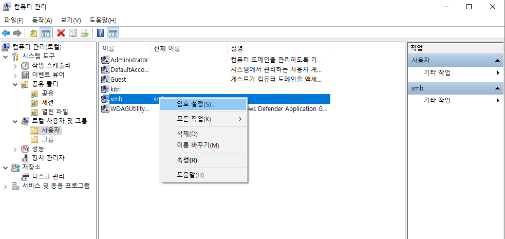3) 사용자를 누르고 smb에 우클릭을 하고 암호를 설정하면 된다.