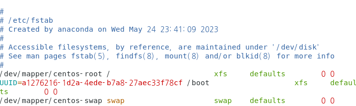 /dev/mapper/centos-swap swap swap defaults 0 0