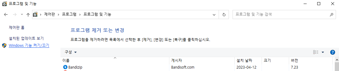1. 프로그램 및 기능을 들어가서 좌측 상단에 Window 기능 켜기/끄기를 클릭한다.