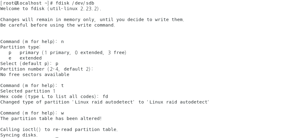 : 우리가 설정할 시스템 id는 Linux raid auto이니 fd를 입력후 w로 저장하고 종료