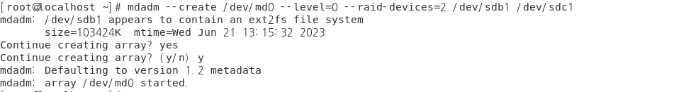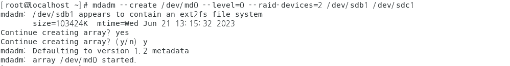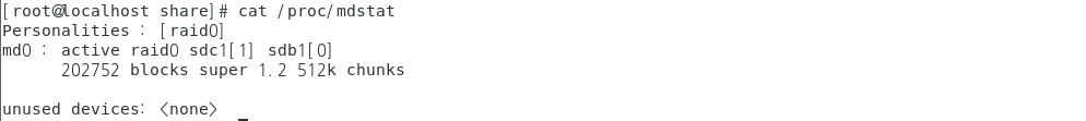 명령어 : mdadm --create /dev/md0 --level=0 --raid-devices=2 /dev/sdb1 /dev/sdc1