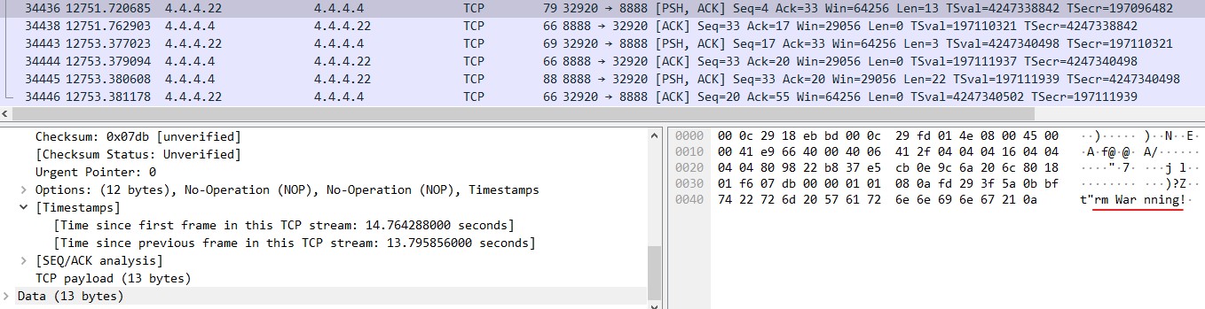 Wireshark에서 공격자가 원격으로 진행한 명령어들이 tcp.port 8888로 확인했다. [PSH] 플래그